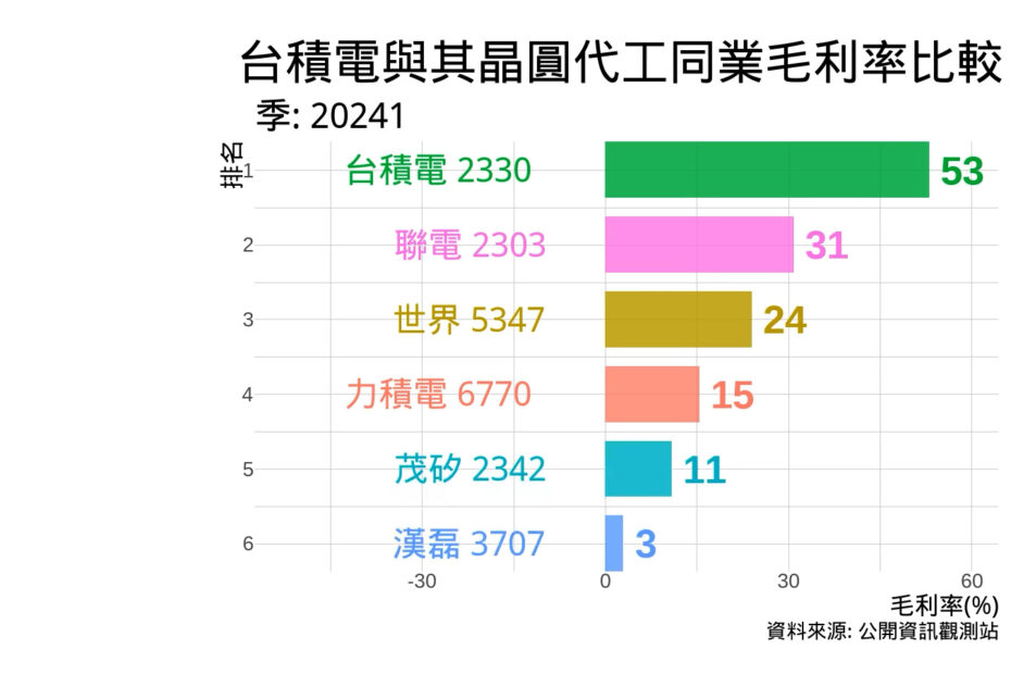 畫面中比較了台股中,台積電與其晶圓代工同業的毛利率比較,晶圓代工同業有,以最新一季2024年第一季的毛利率高低排序,分別是台積電53%,聯電30%,世界24%,力積電15%,茂矽10%,以及漢磊的3%。