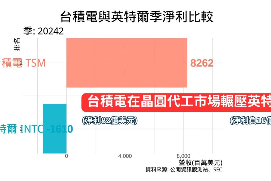 我們比較了世界上兩大晶圓代工龍頭的每季淨利,分別是台積電和英特爾,比較的期間是從2001年第一季到2024年第二季,可以看到大約在2020年之前,大部分的時間英特爾的淨利是大於台積電的,但台積電靠著晶圓代工的技術優勢在2022年第二季開始到目前的兩年內淨利都超越英特爾,英特爾甚至在今年2024年的前兩季都處於虧損狀態,而台積電是連續23年以上每季都維持獲利,非常不容易。我們並解讀了這個獲利轉變的背後意義,包括英特爾在2021年決定重新進入晶圓代工市場,以及其遇到的競爭與挑戰。