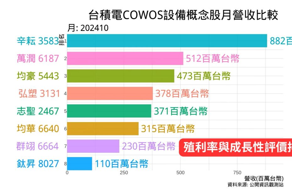 在動畫中,我們比較了8間台積電先進封裝設備概念股的月營收,在2024年10月,台積電COWOS設備概念股月營收前五大的廠商分別是第一名辛耘的8.8億,萬潤的5.1億,均豪的4.7億,弘塑的3.7億,以及第五名志聖的3.7億。接下來我們談到辛耘近期的營運概況,以及這8間COWOS設備概念股的殖利率與成長性評價排名。
