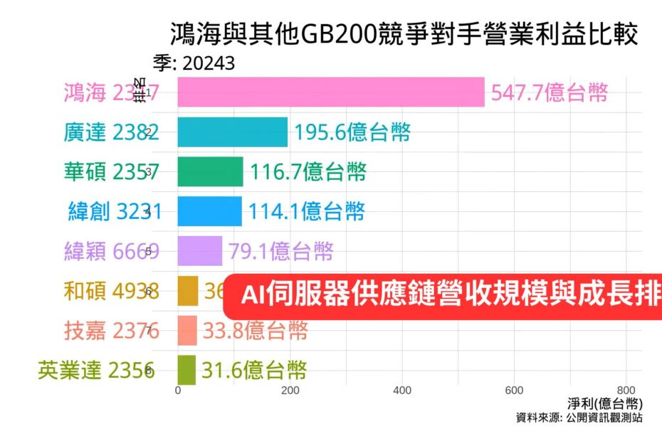 動畫中比較了鴻海與其他GB200供應鏈競爭對手的營業利益比較,比較期間從2023年第一季到2024年第3季,在最新的一季,營業利益排名第一是鴻海的547億台幣,第二名為廣達的195億台幣,第三名為華碩的116億台幣。