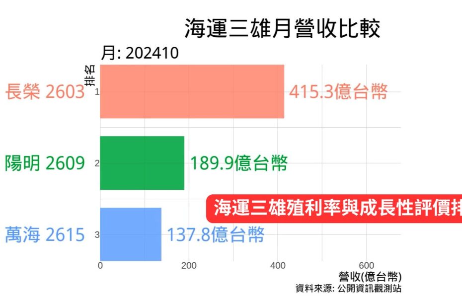 海運三雄月營收比較 長榮 陽明 萬海 至2024年10月 | 海運三雄殖利率與成長性評價排名