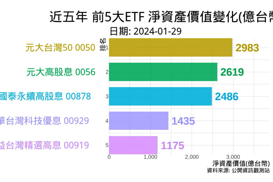 今天,我們好奇來看看在這廣大的台灣ETF市場中,以淨資產價值來看誰的規模最大,在2024年1月29號,所有ETF中規模最大的是0050 元大台灣50的2983億台幣,第二名是0056 元大高股息的2619億,第三名是 00878 國泰永續高股息的 2486億,第四名是00929 復華台灣科技優息 的 1435億,第五名是00919群益台灣精選高息的1175億。
